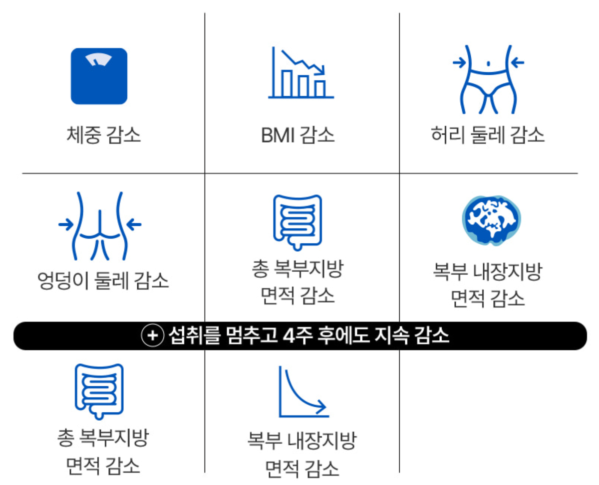 ๊ธฐ๋ฅ์ฑ ์๋ฃ์ธ ํ์ฌ๊ณผ์ถ์ถ๋ฌผ์ ์ธ์ฒด์ ์ฉ ์คํ๊ฒฐ๊ณผ ์ฒด์ค ๊ฐ์, BMI ๊ฐ์, ํ๋ฆฌ ๋๋ ๊ฐ์, ์๋ฉ์ด ๋๋ ๊ฐ์, ์ด ๋ณต๋ถ์ง๋ฐฉ ๋ฉด์ ๊ฐ์, ๋ณต๋ถ ๋ด์ฅ์ง๋ฐฉ ๋ฉด์ ๊ฐ์๋์์ผ๋ฉฐ, ์ญ์ทจ๋ฅผ ๋ฉ์ถ๊ณ 4์ฃผ ํ์๋ ์ง์์ ์ผ๋ก ๋ณต๋ถ์ง๋ฐฉ ๋ฉด์ ์ด ๊ฐ์๋๋ ๊ฒฐ๊ณผ๊ฐ ๋ํ๋ฌ์ต๋๋ค.
