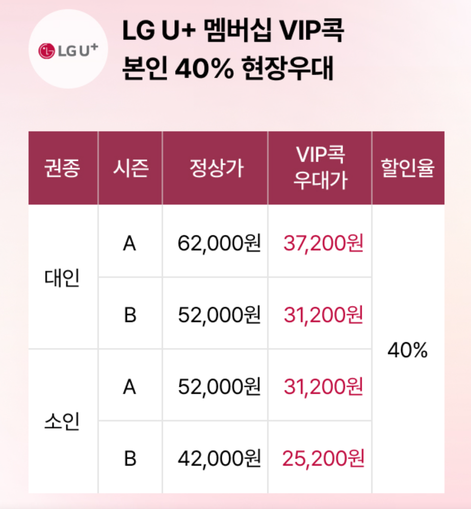 LG U+λ₯Ό μ΄μ©νμ λ€λ©΄ 40% ν μΈμ λ°μ μμ μ΄μ©κΆμ ꡬ맀ν μ μμ΅λλ€.